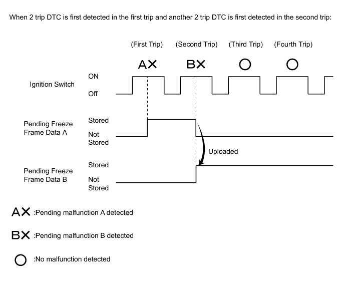 * With previous pending freeze frame data stored, if pending freeze frame data is newly stored when a 2 trip DTC is detected in the first trip, the old freeze frame data will be replaced with the new one of the newly detected DTC in the next trip.