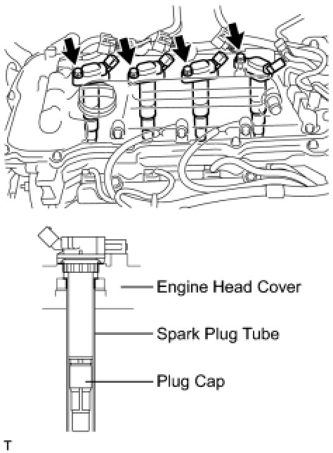 When installing each ignition coil, do not damage the plug cap on the engine head cover opening or the upper edge of the spark plug tube.