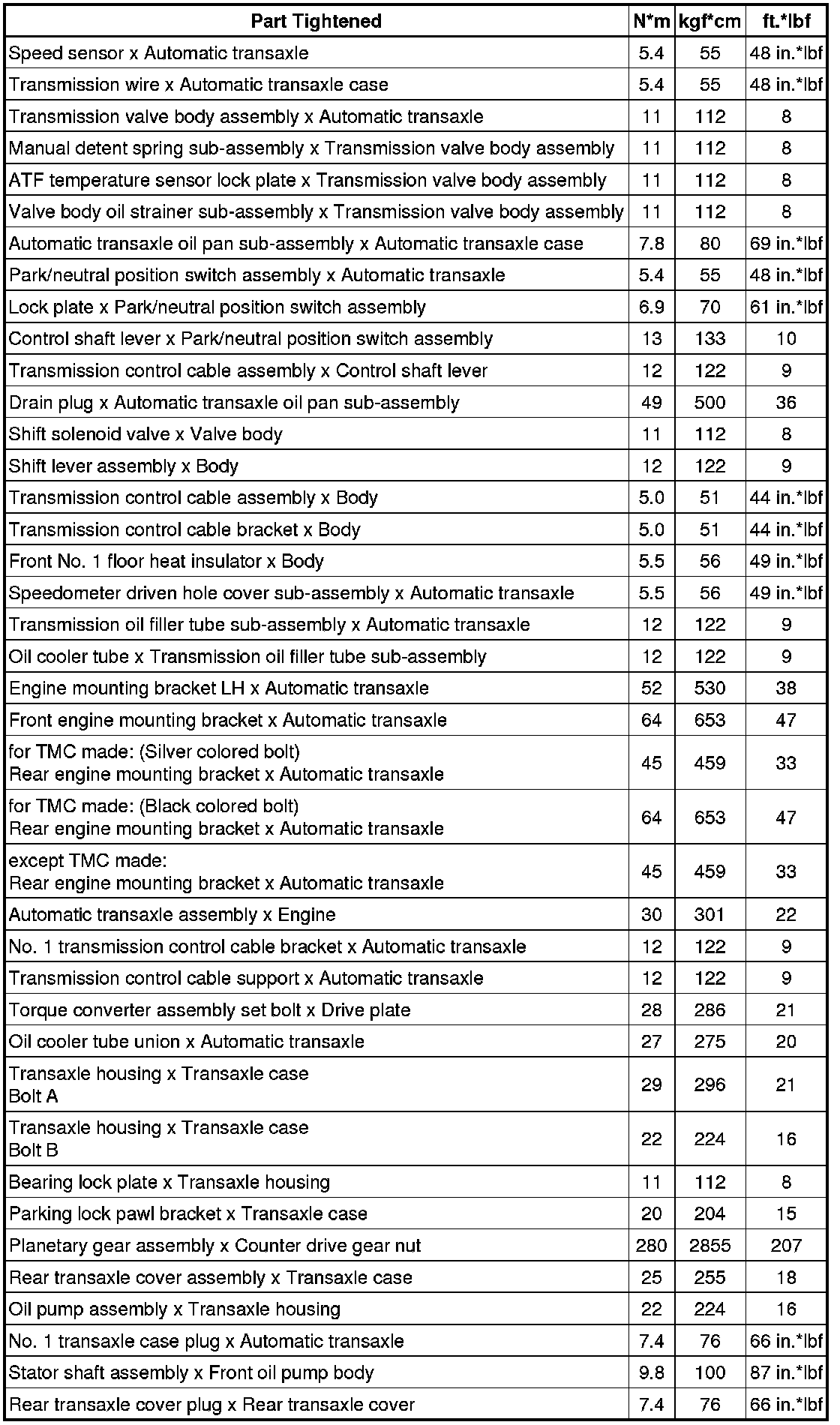 SPECIFICATIONS: U341E AUTOMATIC TRANSMISSION / TRANSAXLE: TORQUE SPECIFICATIONS; 2013 MY Corolla [07/2012 -]