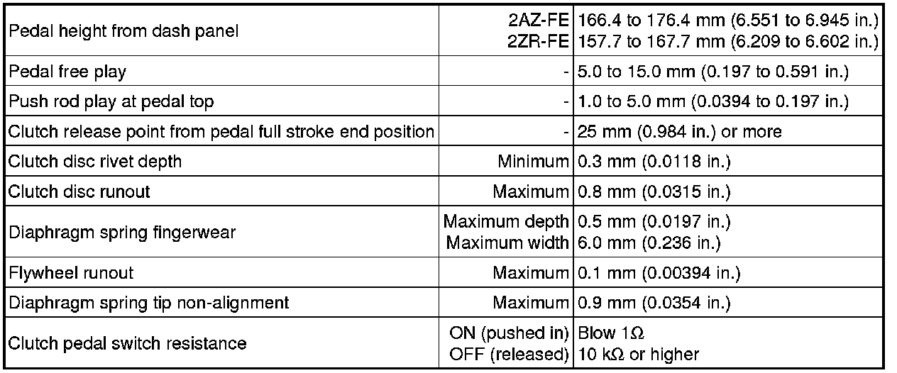 SPECIFICATIONS: CLUTCH: SERVICE DATA; 2013 MY Corolla [07/2012 -]