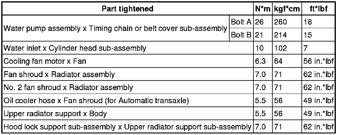 SPECIFICATIONS: 2ZR-FE COOLING: TORQUE SPECIFICATIONS; 2013 MY Corolla [07/2012 -]