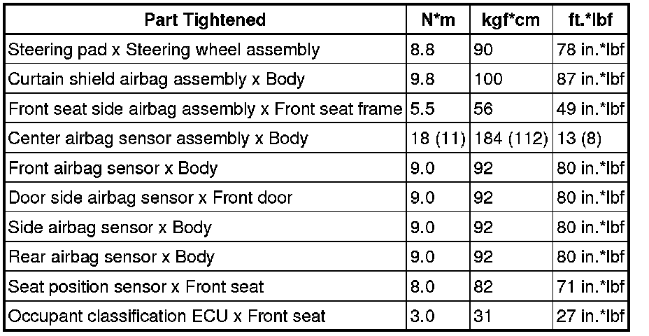 SPECIFICATIONS: SUPPLEMENTAL RESTRAINT SYSTEMS: TORQUE SPECIFICATIONS; 2013 MY Corolla [07/2012 -]