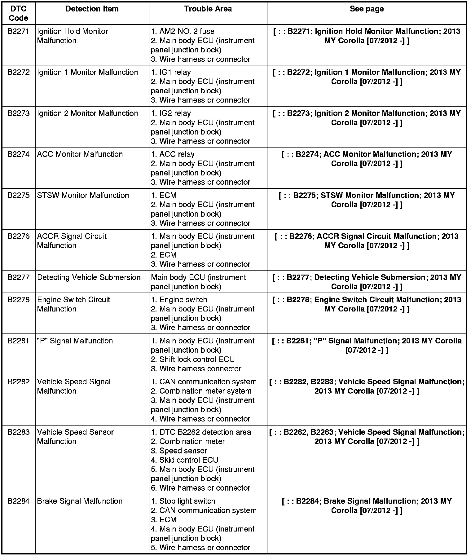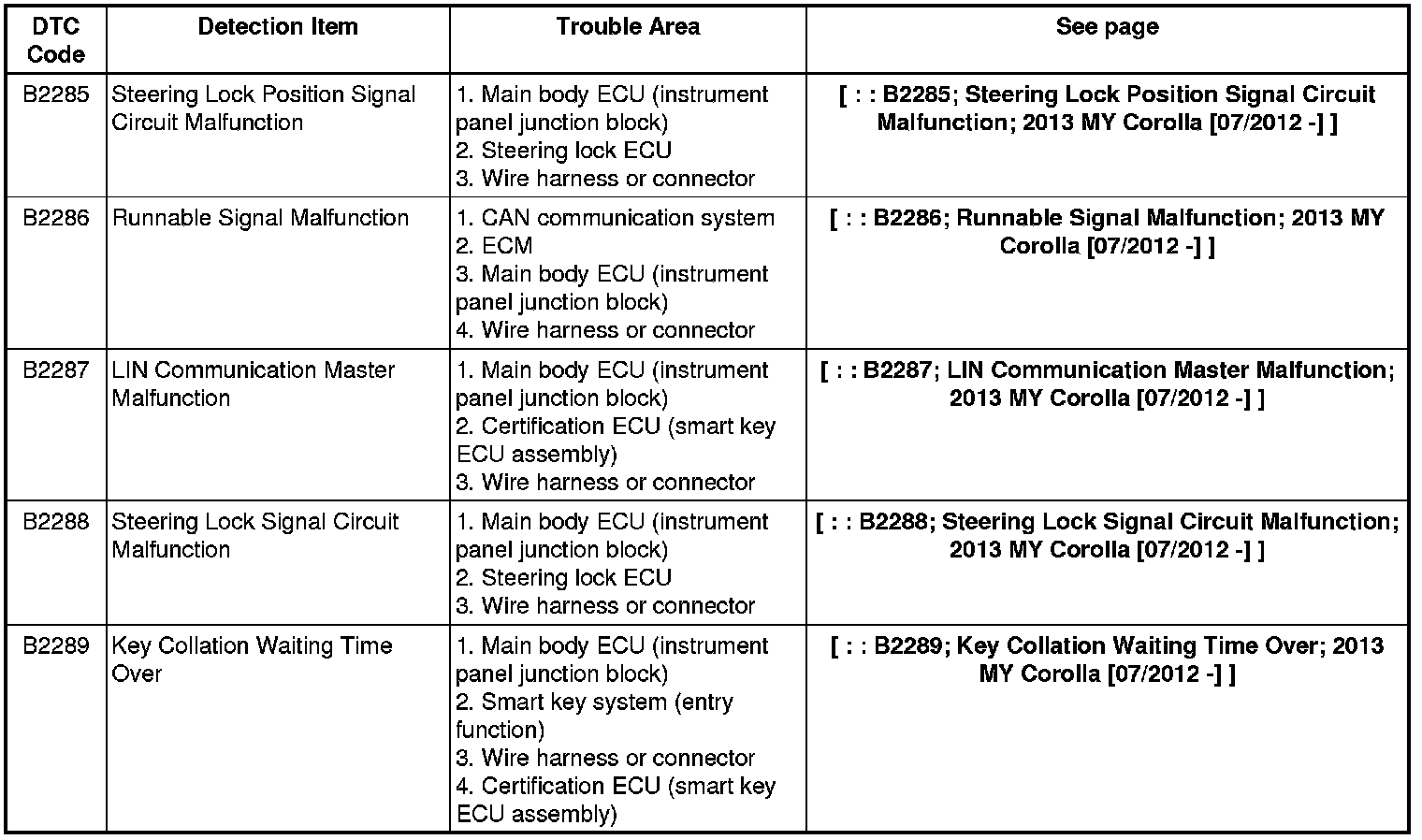 THEFT DETERRENT / KEYLESS ENTRY: SMART KEY SYSTEM (for Start Function): DIAGNOSTIC TROUBLE CODE CHART; 2013 MY Corolla [07/2012 -]