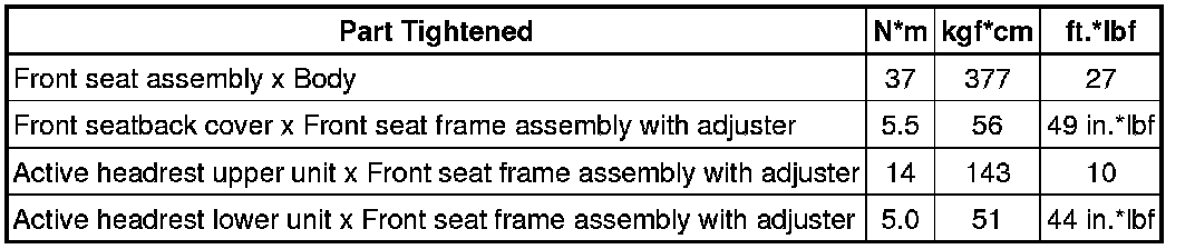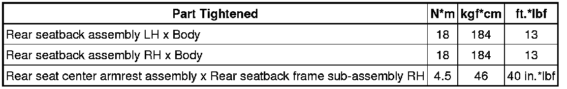 SPECIFICATIONS: SEAT: TORQUE SPECIFICATIONS; 2013 MY Corolla [07/2012 -]