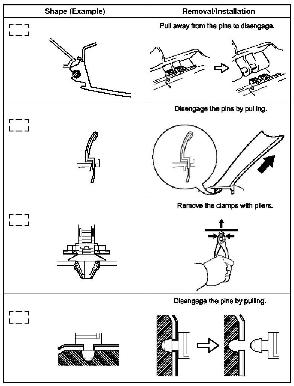 (1) The removal and installation methods of typical claws used for vehicle body parts are shown in the table below.
