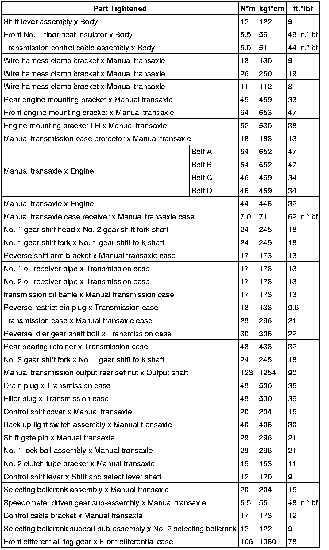SPECIFICATIONS: E351 MANUAL TRANSMISSION / TRANSAXLE: TORQUE SPECIFICATIONS; 2013 MY Corolla [07/2012 -]