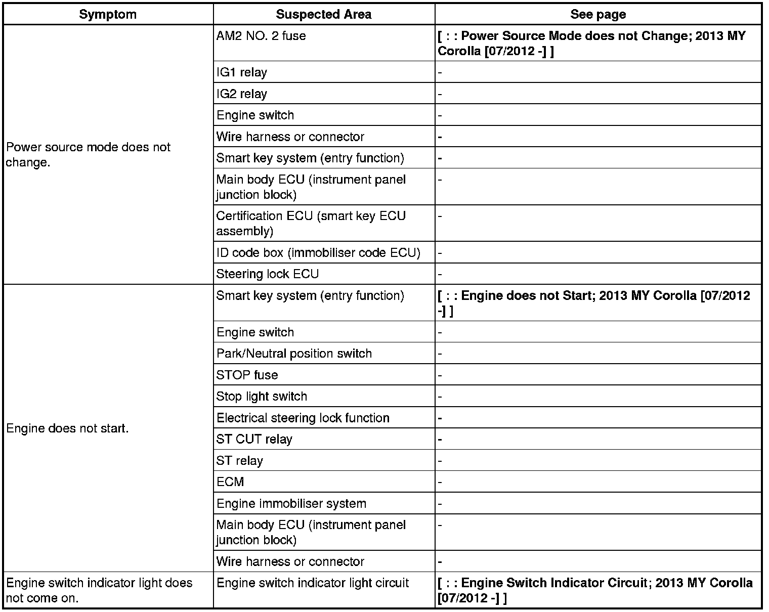 THEFT DETERRENT / KEYLESS ENTRY: SMART KEY SYSTEM (for Start Function): PROBLEM SYMPTOMS TABLE; 2013 MY Corolla [07/2012 -]