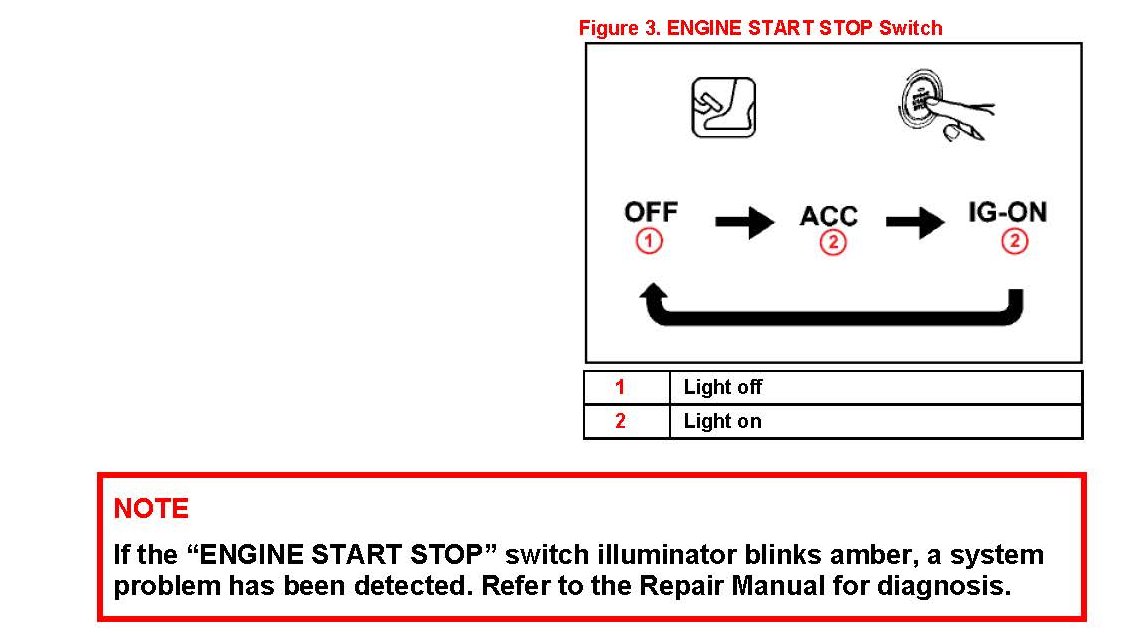 (2). Without depressing the brake pedal, press the "ENGINE START STOP" switch and confirm the mode changes properly.