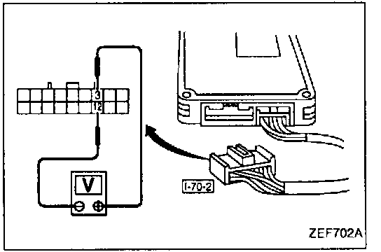 2. Measure voltage between terminal (3) (+ end) of instrument harness connector [I-70-2] and body ground (- end).