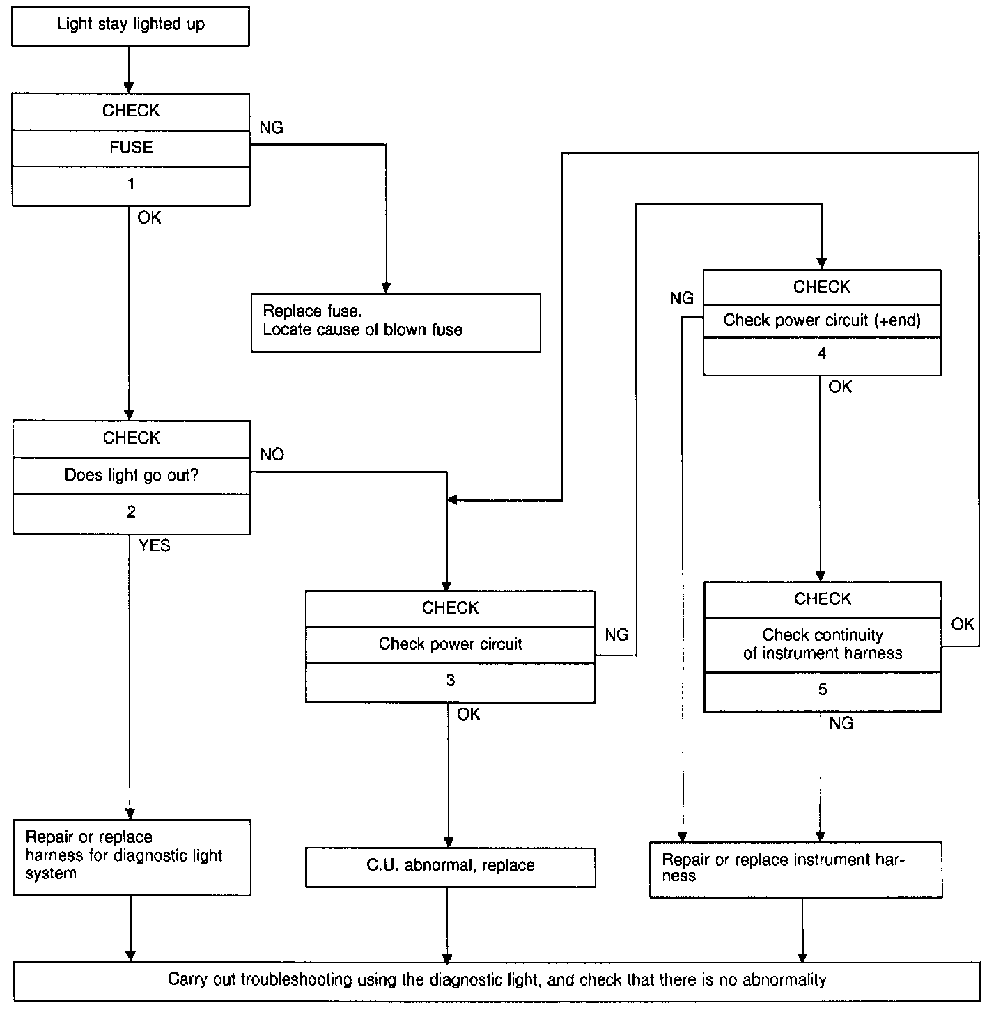 - Lamp stays ON -> abnormality in wiring harness of diagnostic light system -> repair or replace harness