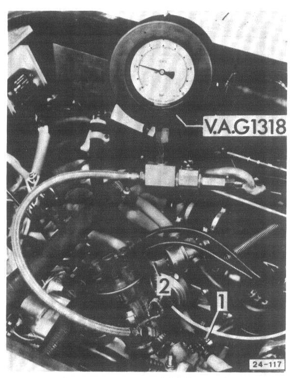 - Connect pressure gauge VAG 1318 or equivalent with adaptor to T-piece 1 of fuel line