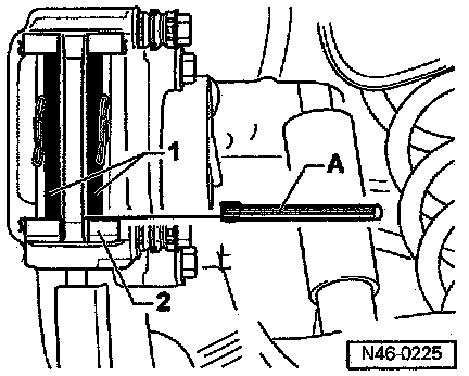 - Measure clearance between brake pads -1- and anti-rattle springs on brake carrier -2- with feeler gauges -A-.