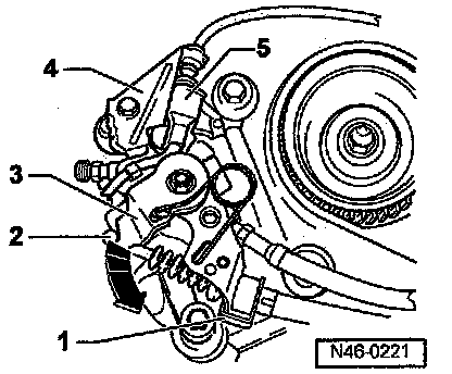 - Press brake lever -3- in direction of arrow and connect parking brake cable -2,