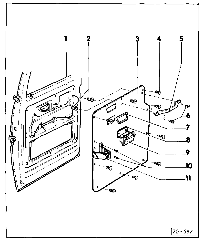 - Removing: Remove door check strap -11-, handle -5-, unclip trim -7-, remove clips -4- and trim
