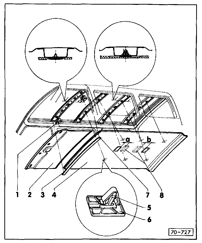 - To remove molded headliner in front passenger compartment, remove upper B-pillar trim See Removing/Installing See 'Trim Panel.' Service and Repair - To remove rear molded headliner, remove upper B-pillar trim , C-pillar trim, D-pillar trim, rear headliner trim Removing/Installing See 'Trim Panel.' Service and Repair