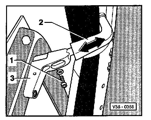 - Loosen hex recess bolt -1-, slide upper roller guide -2- on bracket -3- -arrows- until top front of sliding door matches outer B-pillar contour.