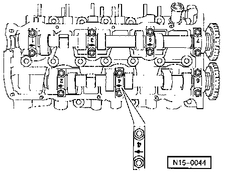NOTE: Bearing cap identification must be readable from the exhaust side of the cylinder head and the arrow pointing to vibration damper end.