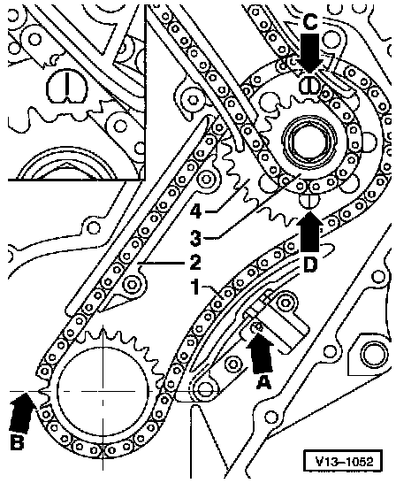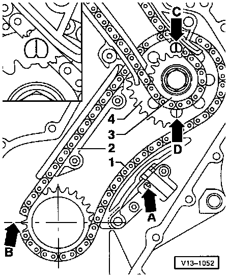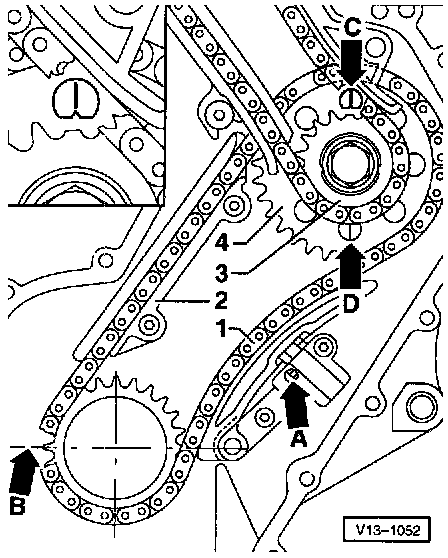 Ground down tooth on crankshaft sprocket -13- must align with the main bearing joint (= TDC for cyl. 1)