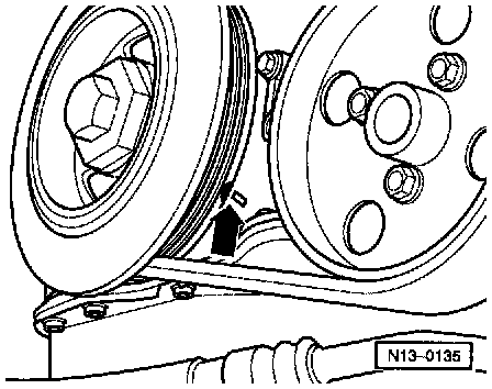 - Set crankshaft to TDC (cyl. 1) marks -arrow- by turning crankshaft in direction of engine rotation using vibration damper mounting bolt