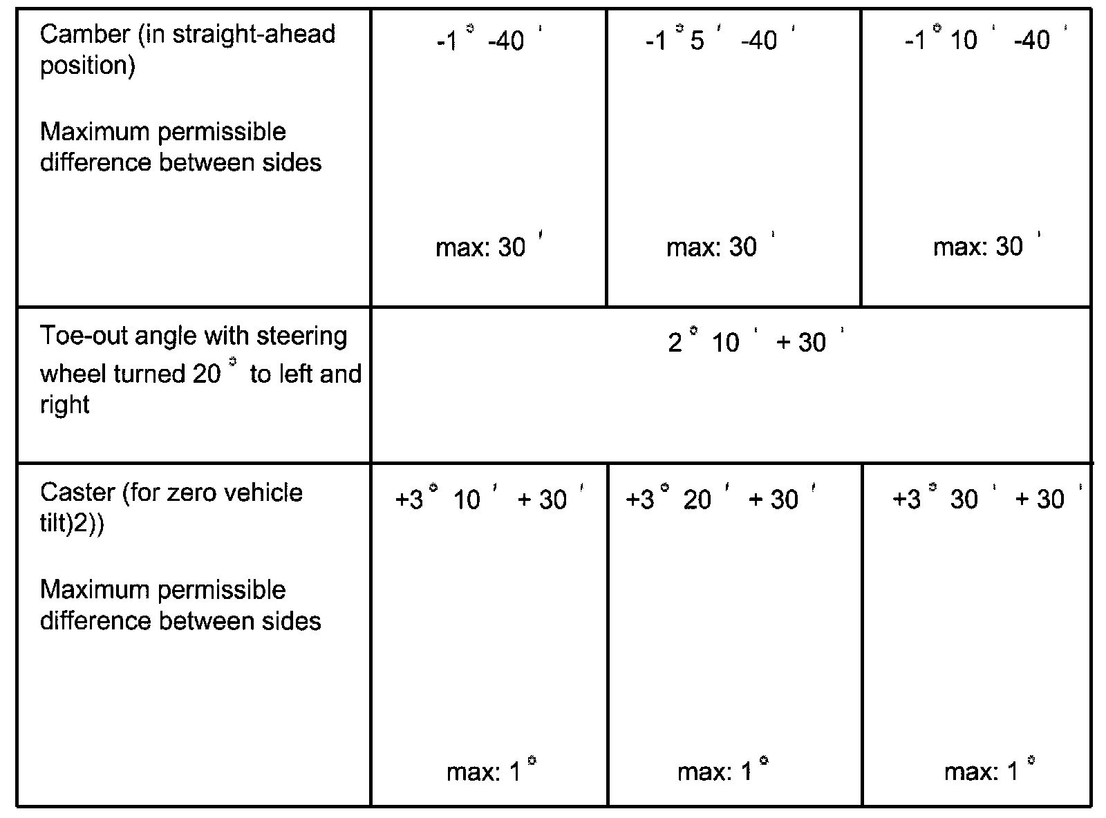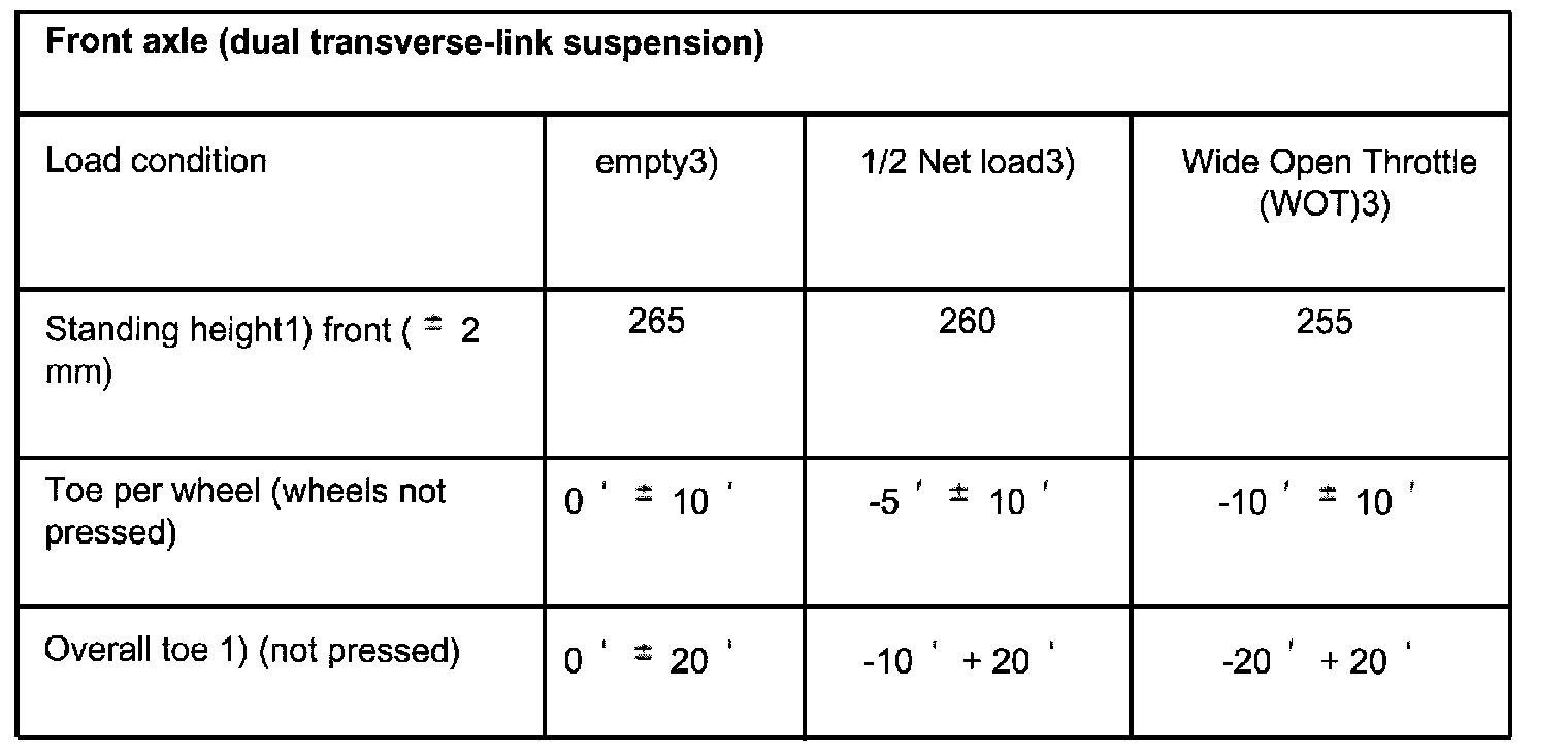 1) If vehicle height (ride height) has to be adjusted, the front axle alignment should be checked in full. After adjusting the vehicle height, push vehicle forwards and backwards over approx. 2m, then re-check height.