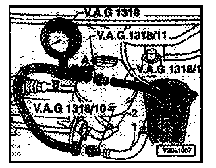 - Push VAG 1318/1 hose onto VAG 1318/11 adapter on pressure gauge and hold hose over a measuring container.