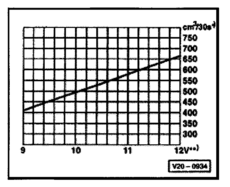 During test, 12.5 Volts is measured at battery. Pump voltage is approx. 2 Volts less than the battery equating to a minimum delivery of 500 cc's in 30 seconds