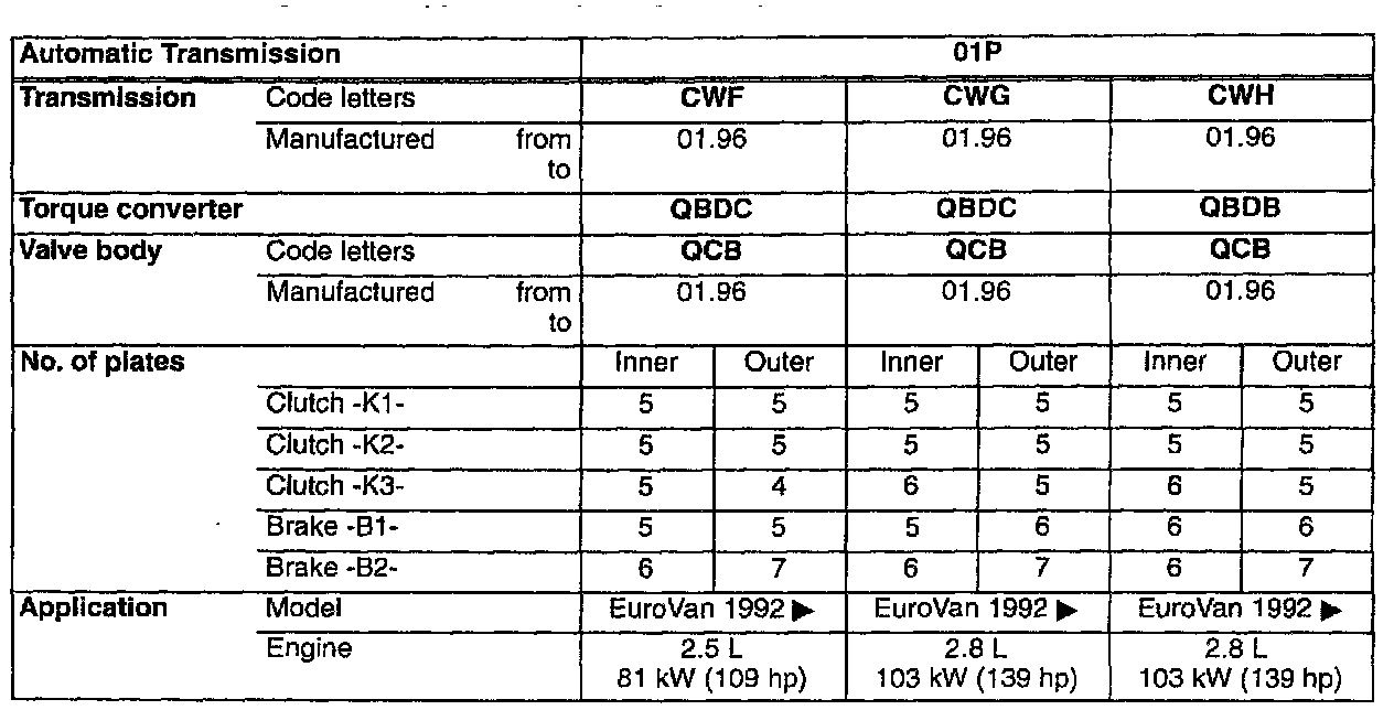 - Refer to the tables below for internal configurations of the 01P automatic transaxle.