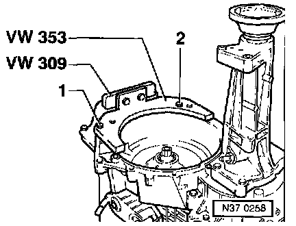- Secure transmission to assembly support with bolts -1- and -2-.