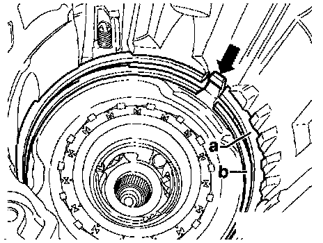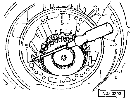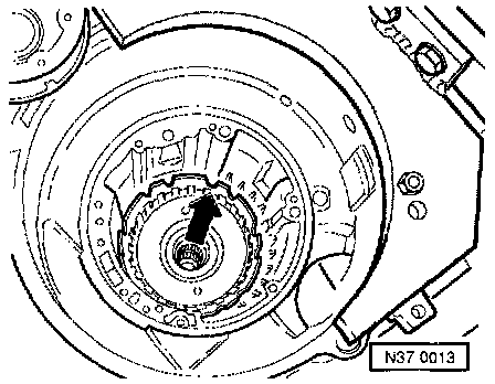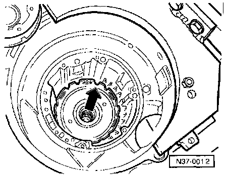 - Take free wheel out of transmission housing by pulling on the wheel retaining wedge -arrow- with pliers.
