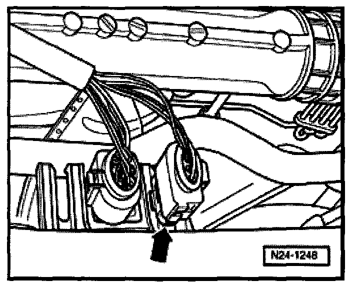- Disconnect 4-pin harness connector (arrow) to Oxygen Sensor (O2S) behind Three Way Catalytic (TWC) Converter -G130- behind Three Way Catalytic (TWC) Converter (bank 1).