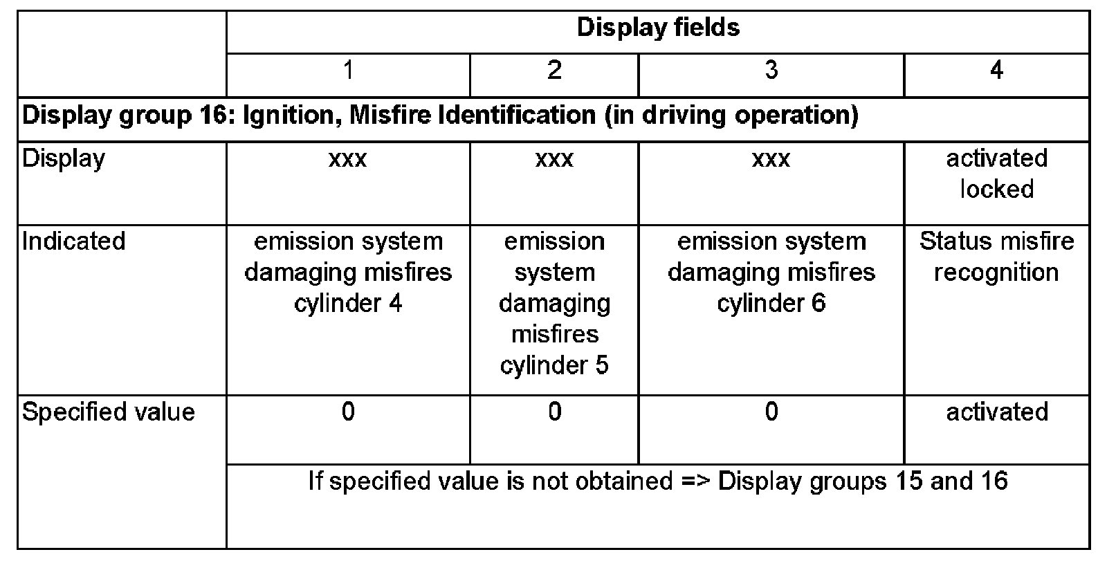 Evaluation of display groups 15 and 16, display fields 1 to 3 - total number of emissions -damaging misfires cyl. 1 through cyl. 6