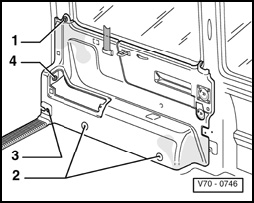 - Remove Phillips screw - 1 -, - 2 - (with cap) and carefully pry out belt guide with closure strips - 3 - and/or seat belt.