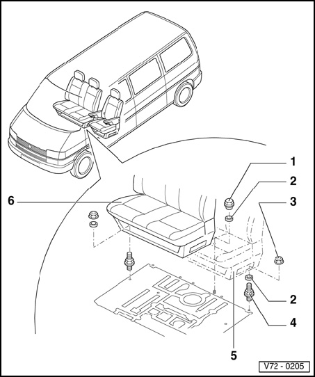 - Removing: Remove hex nuts - 3 -, remove seat from vehicle.
