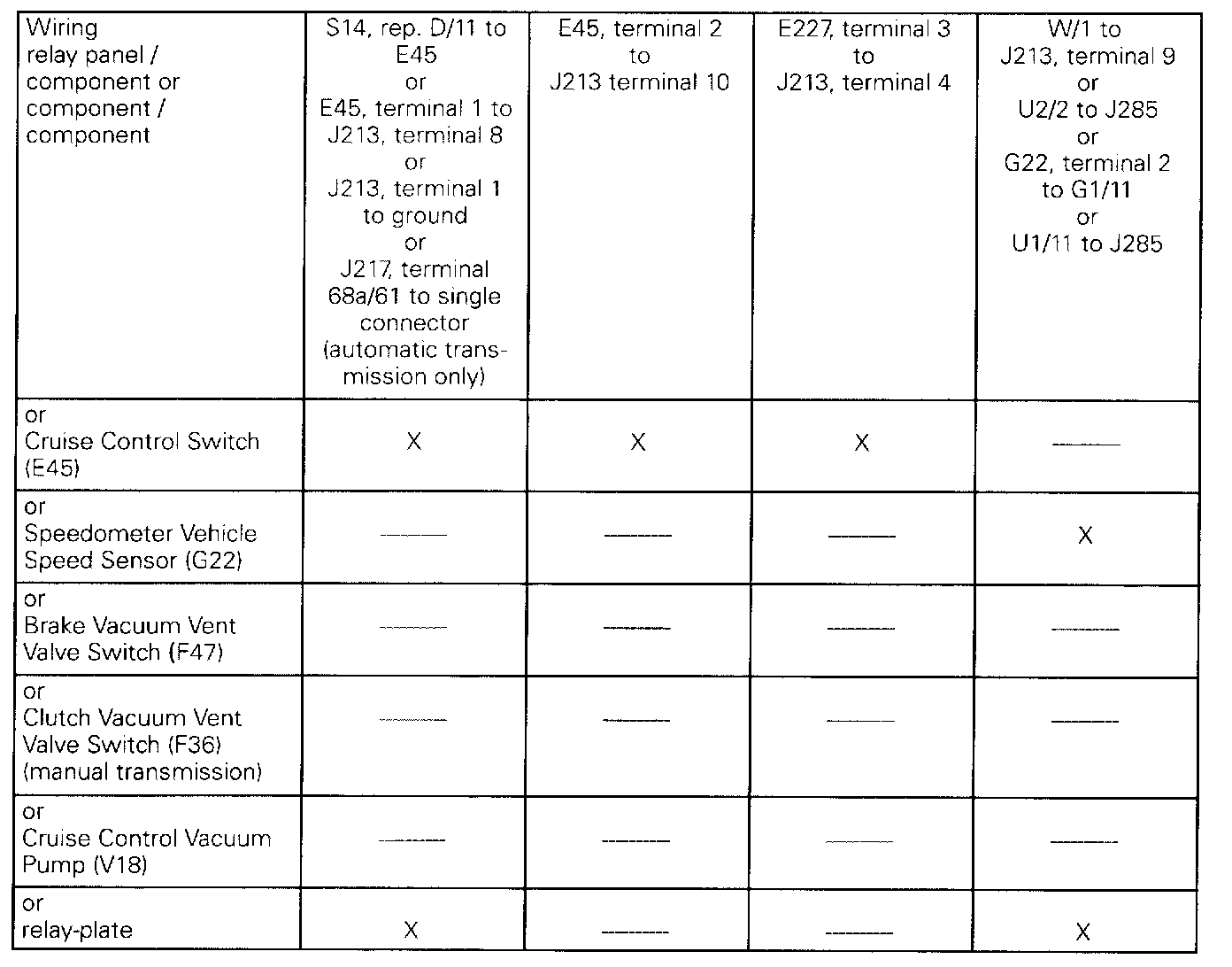 - Connect single connector (choose the side which is wired to the cruise control switch) to terminal 2 of relay-holder for Rear Window Wiper/Washer Relay, location 2, using Connector Test Kit VW1 594. Refer to wiring diagram to confirm connections.