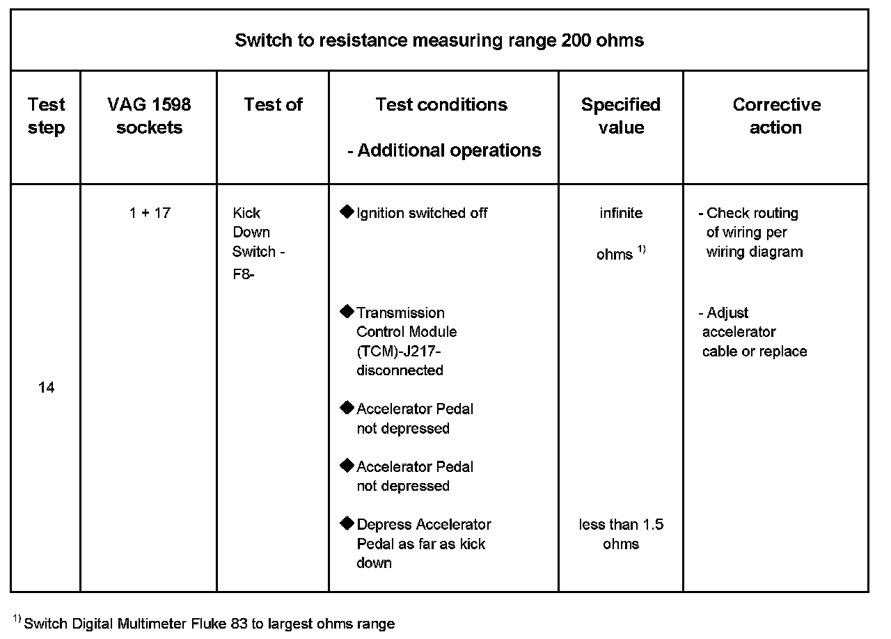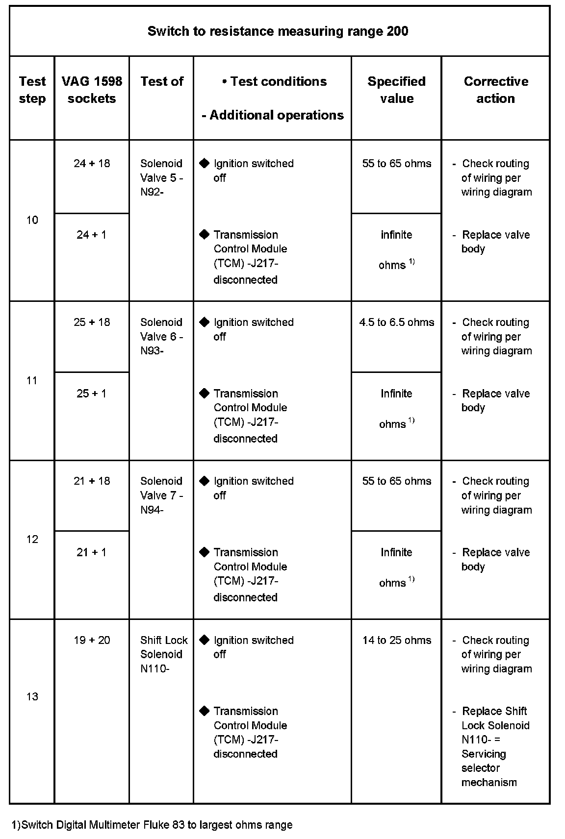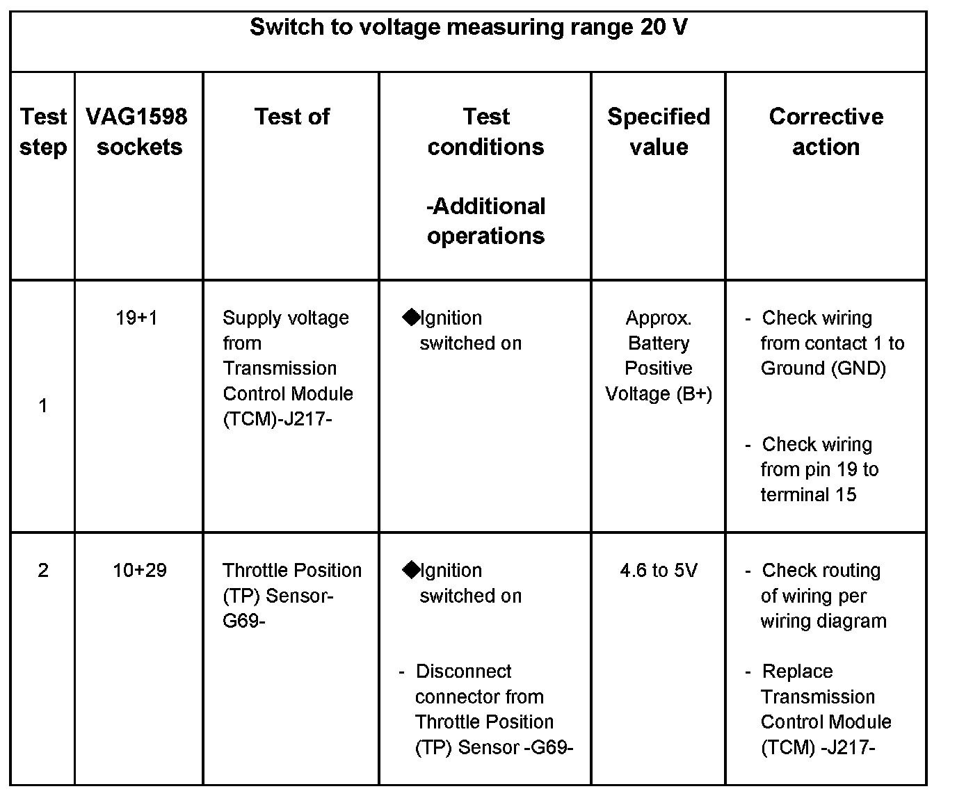 Terminal assignment for 38-pin Transmission Control Module (TCM) -J217- connector (also sockets on VAG 1598 Test Box)