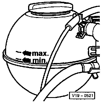 - Check coolant level and top off with coolant if necessary. With engine at operating temperature, coolant level must be at max. marking, with engine cold, coolant level must be between the min. and max. marks