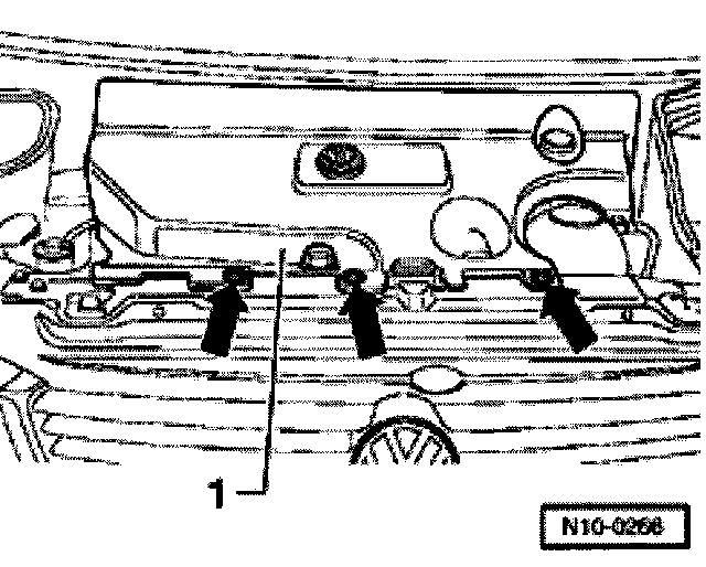 - Remove engine cover -1-. To do so; remove 3 bolts (arrows).