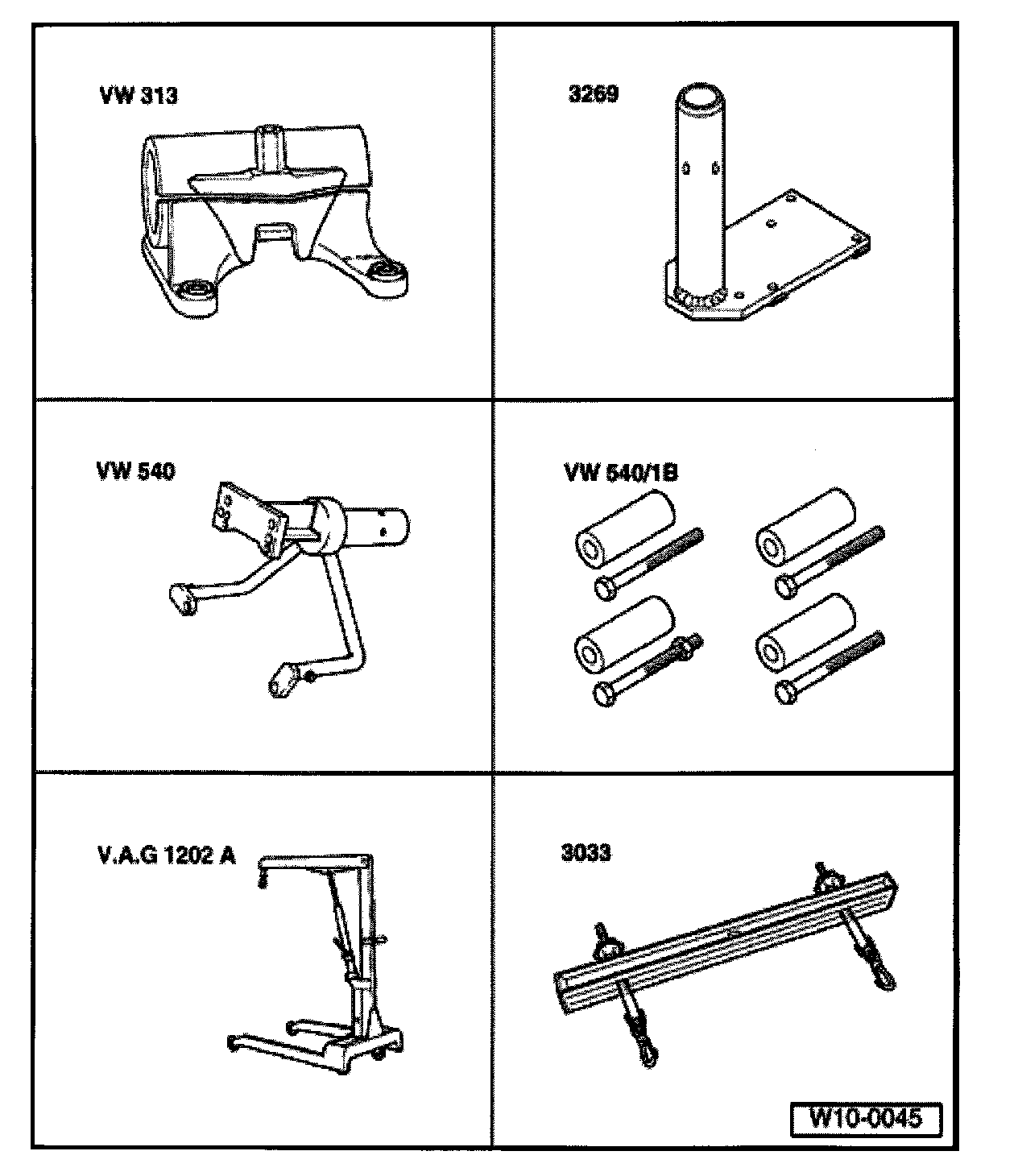 To perform engine work, mount engine to VW313 holding fixture of assembly stand using VW 540 holding fixture. When the exhaust manifold is removed from cylinder head, 3269 engine support can be used. Otherwise, use VW540/1B spacers.