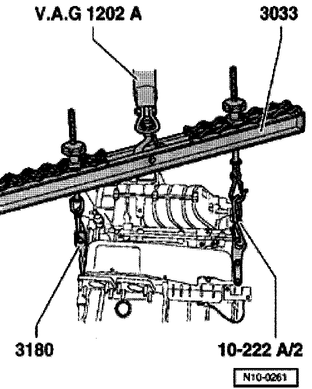- Engage 3033 engine sling as follows and lift out engine using VAG1202A workshop crane from VAG1383A engine/transmission jack.