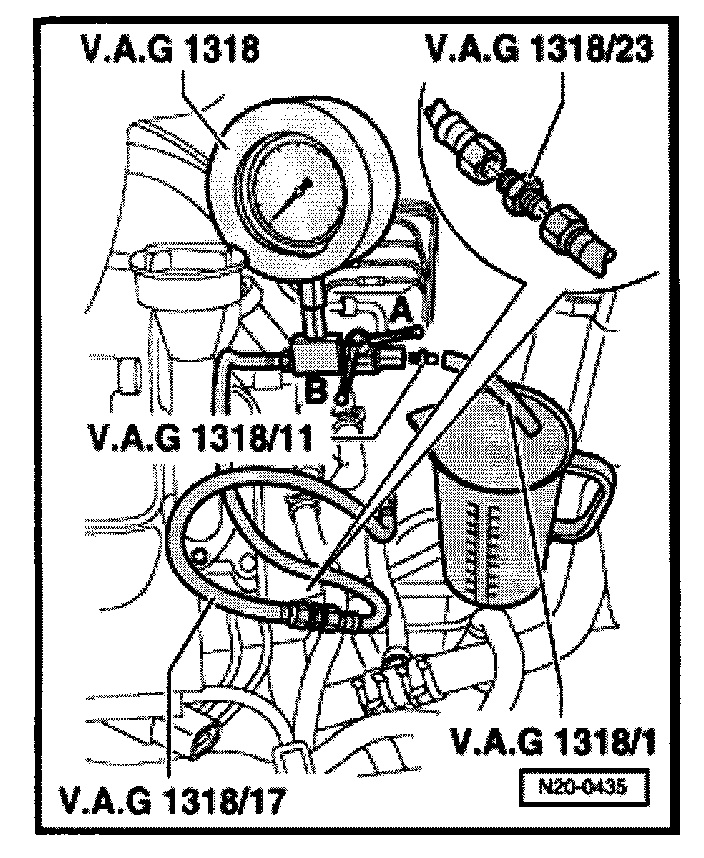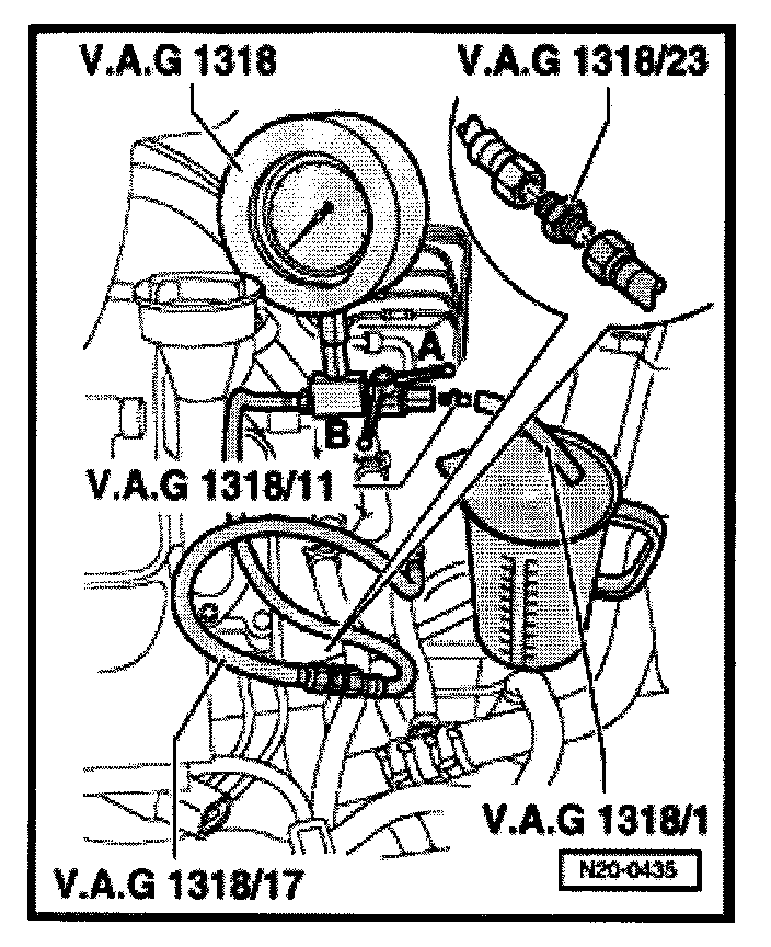 - Connect pressure gauge VAG1318 to fuel supply line using adapters VAG1318/23 and VAG1318/17.