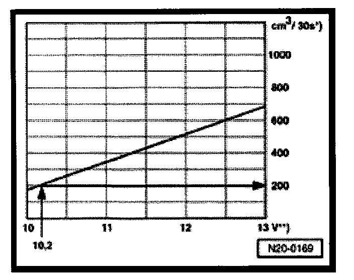 During test, a voltage of 12.2 volts is measured at battery. Since the voltage at the pump is approx. 2 volts less than battery voltage, there is a minimum delivery rate of 550 cubic cm/30 s.