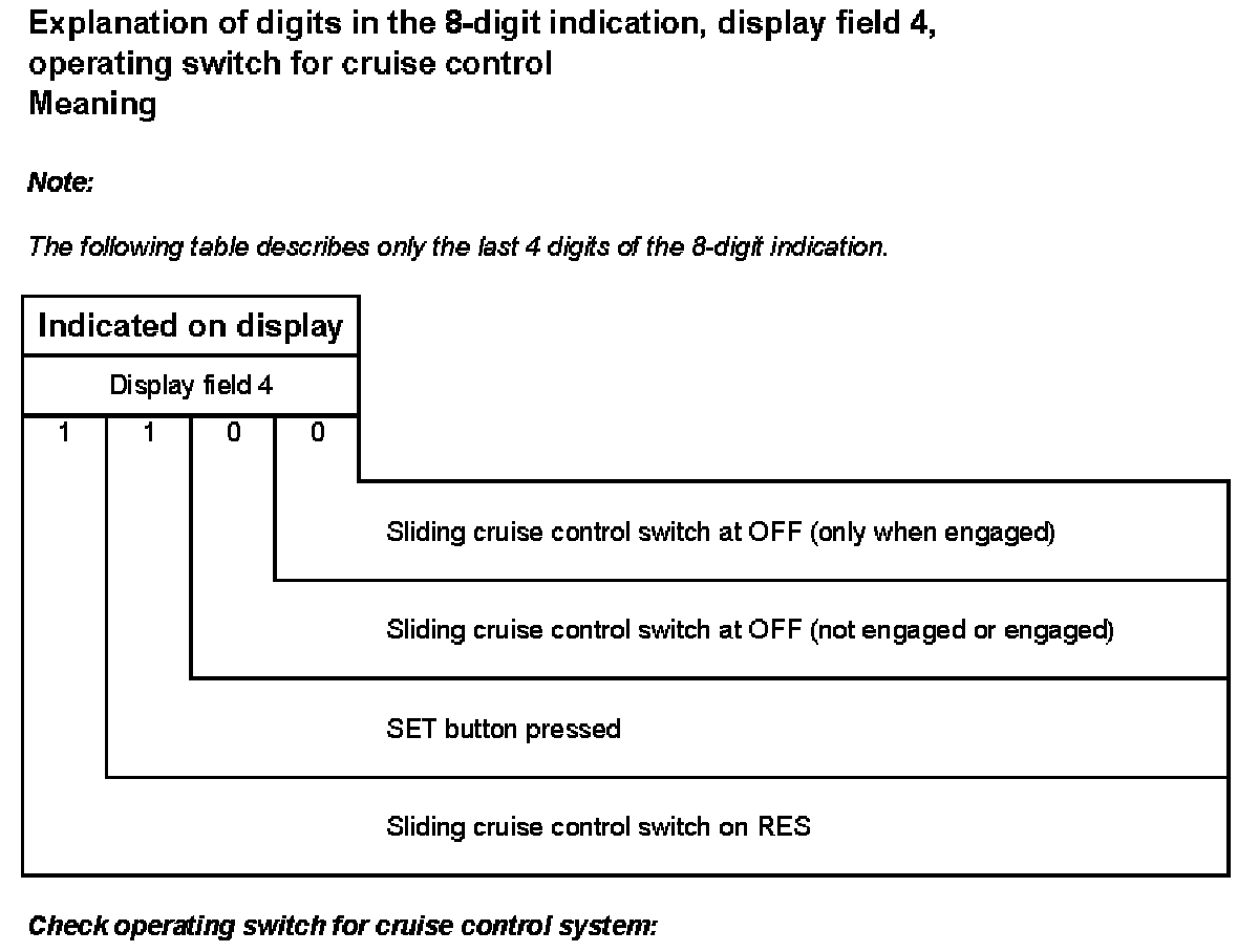 Explanation of digits in 8-digit indication, display field 4, operating switch for cruise control.