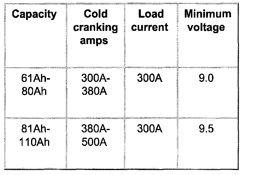 - Load current and minimum voltage specifications vary depending on battery capacity. Apply load as per tester instructions, or for 5 seconds at load specified below: