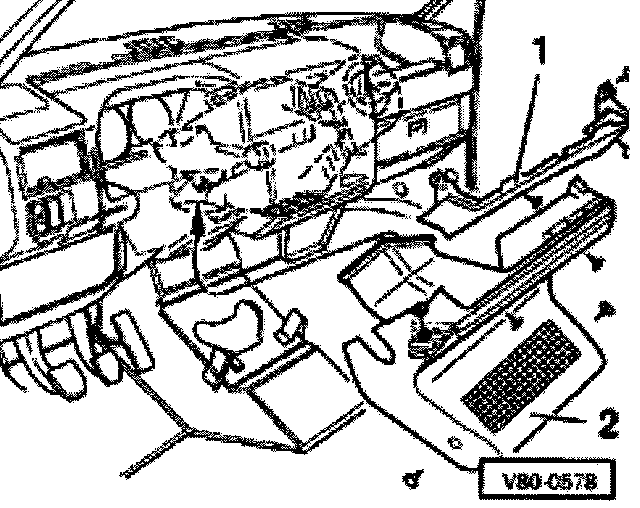 ^ Loosen console for footwell duct -2- and remove.