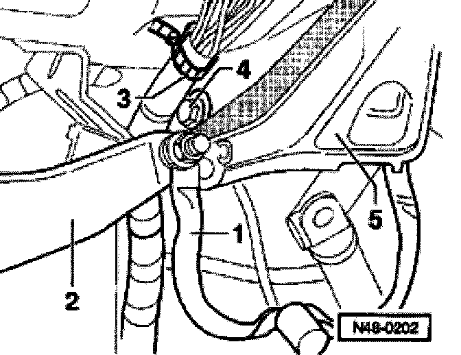 ^ Remove bracket -1-, if installed and brace -2- from steering column tube -5-.