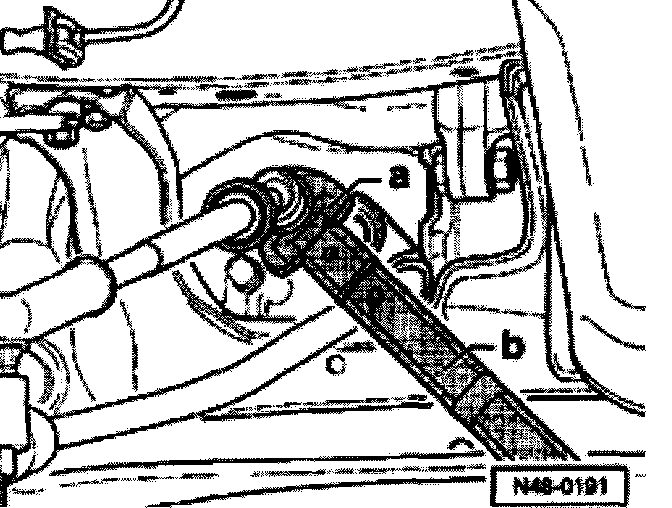 ^ Turn stabilizer upward by approximately 90° and pull out toward left at the same time. Observe right coupling rod when removing stabilizer.
