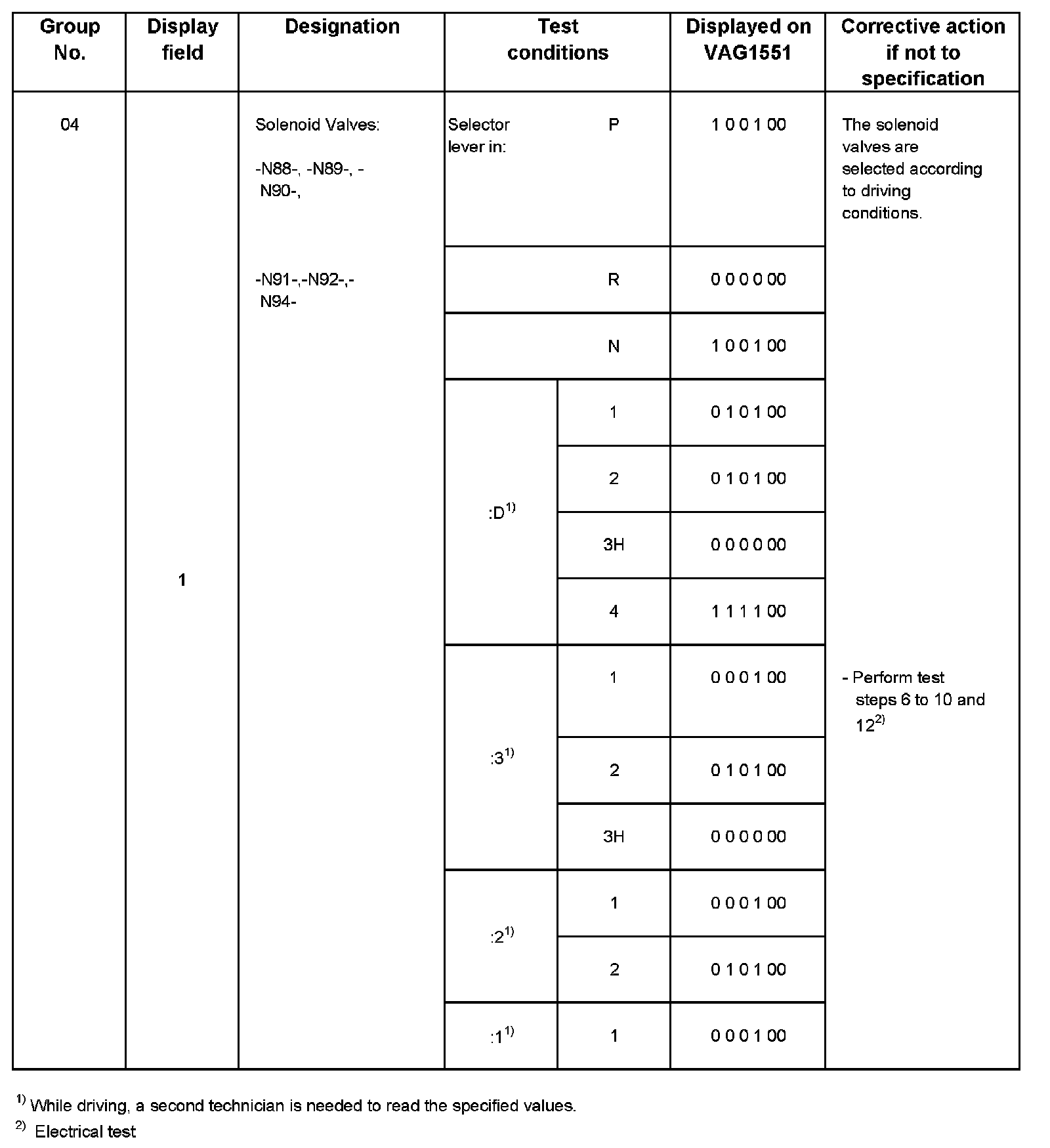 The solenoid valves can be checked while driving by accessing "read measured value block" function -08-; "display group number 04" and display field -1- using VAG 1551 Scan Tool (ST).