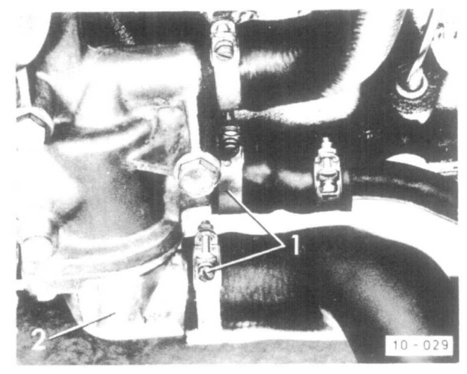 Hose clamps (1) and thermostat housing (2).