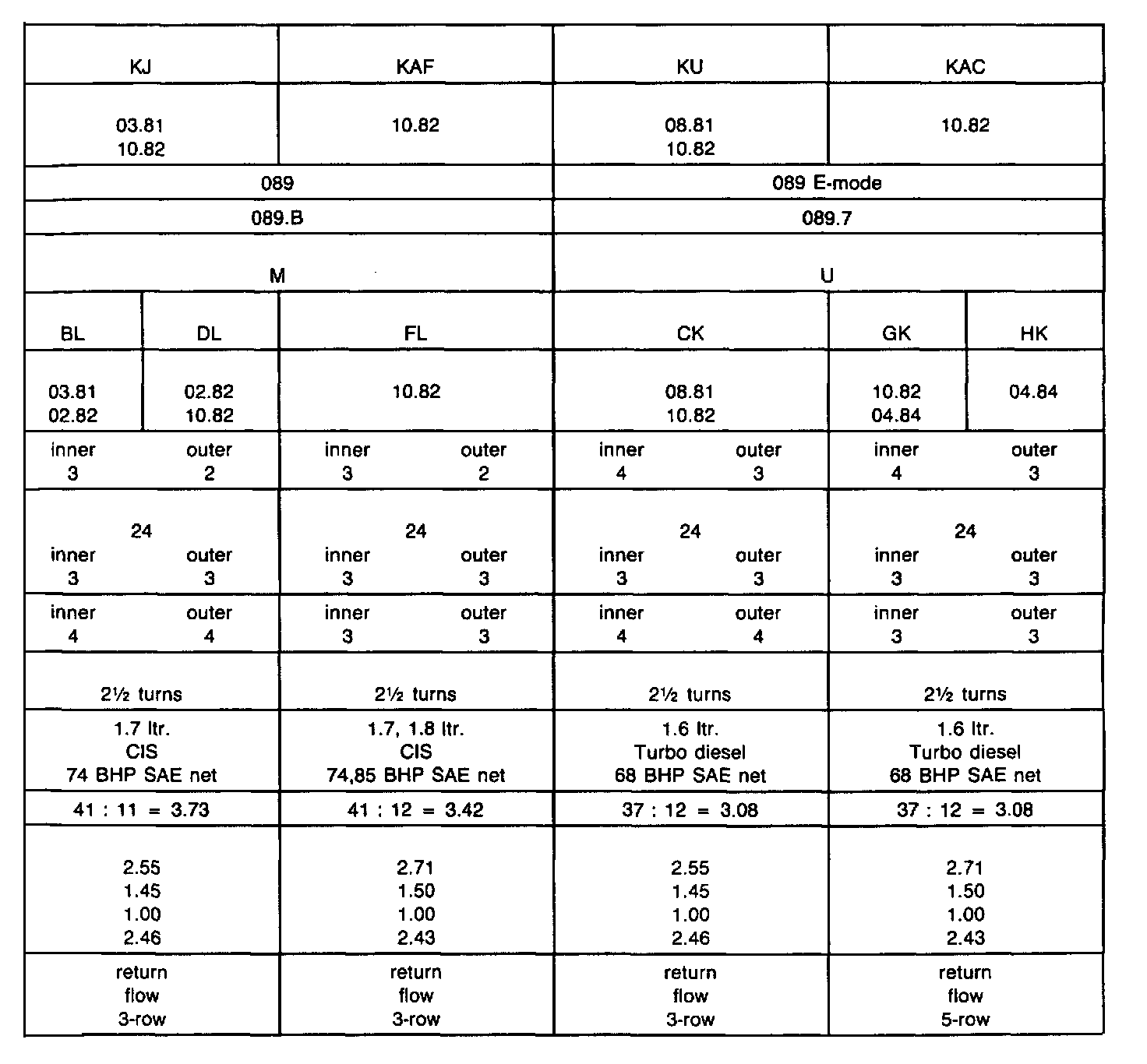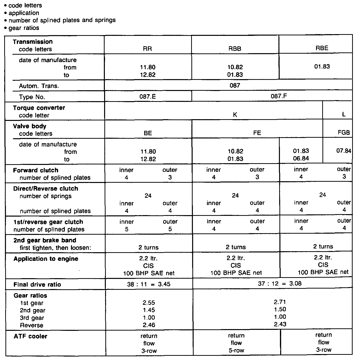 Valve Spring Table - 087 Transmission: