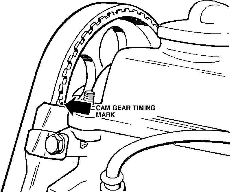 b. Mark on the camshaft gear aligns with the top edge of the valve cover flange,